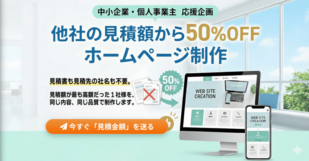 お知らせ 2026.02.20 中小企業・個人事業主応援キャンペーン『他社の見積額から50%OFF』 和禅雅は中小・零細企業・個人事業主の皆さまを応援します。 「ホームページ、必要なのは分かっているけど見積依頼をすると金額が高くて作れない…」 そんな悩みをお持ちの方の為に他社の見積額の半値で同じ内容のホームページを作成します。 ただし、月に一社限定です。 詳しくはこちらをご覧ください。